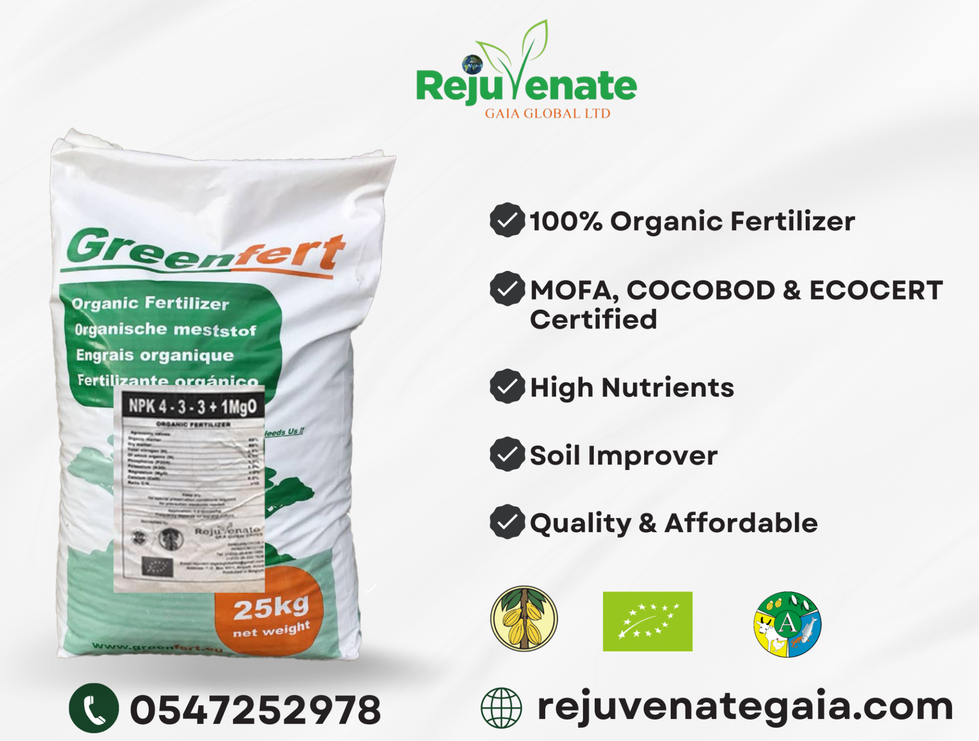 Rejuvenate Gaia Global Limited is a licensed and importer of Greenfert Organic Granular Fertilizer a hundred percent Organic Fertilizer and Soil improver. They are sold and distributed to farmers, adding value to their produce, increasing productivity and rejuvenating farmlands.